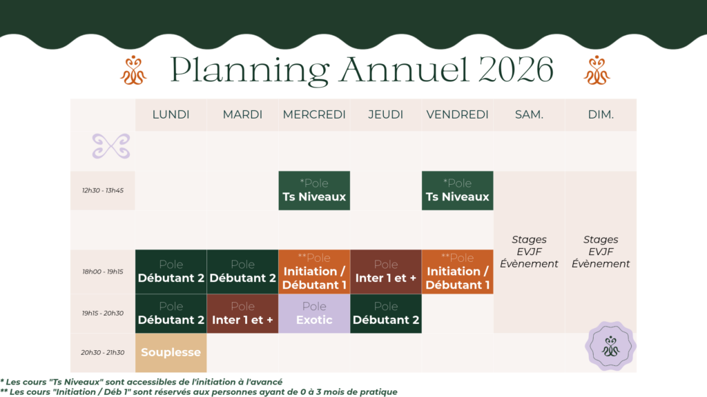Juste ici, tu trouveras le planning annuel des cours 👇 Pour réserver une séance, rend-toi un peu plus bas sur le planning interactif d’Eversports, et clique sur le cours souhaité.